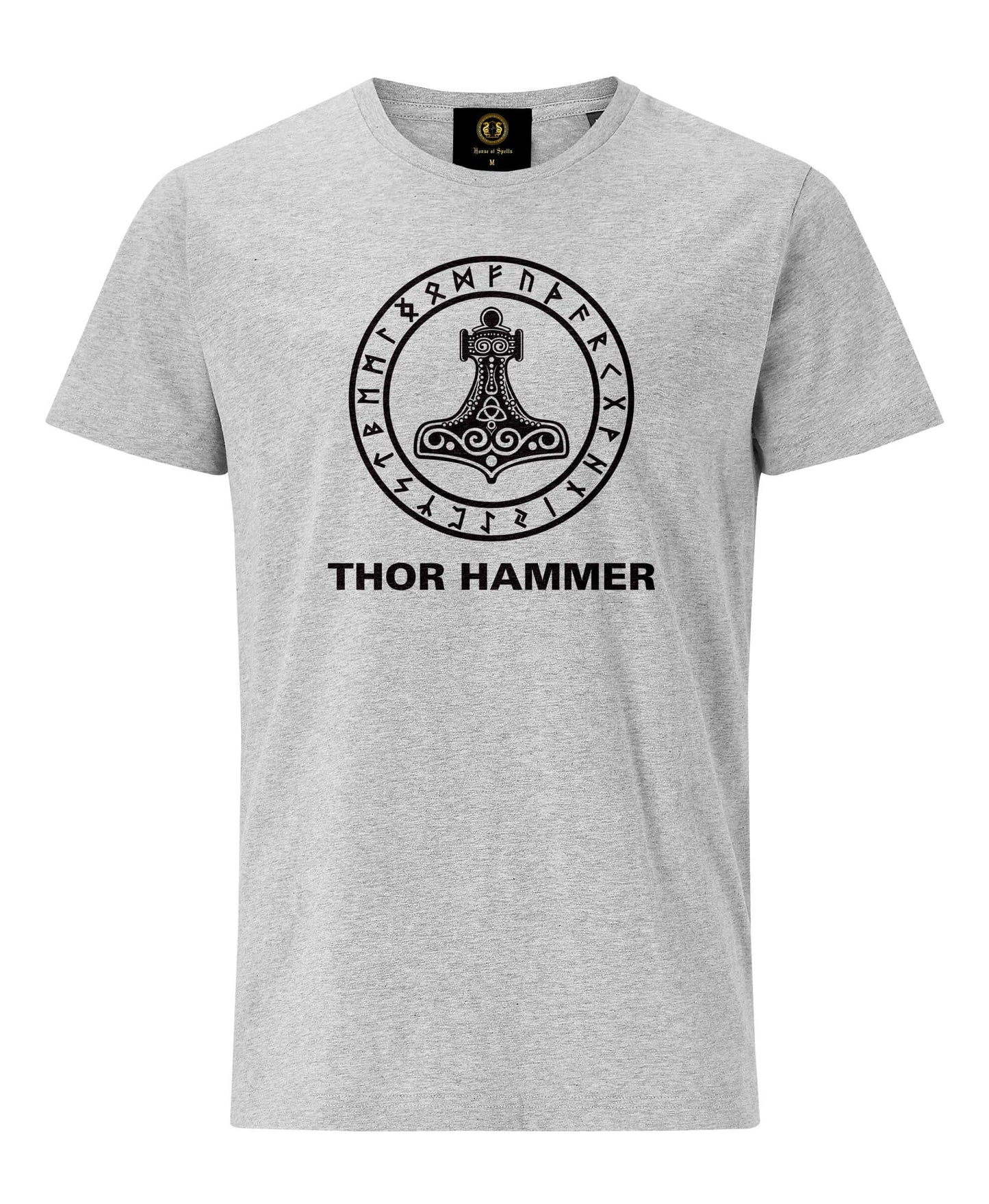 Show your Viking roots and passion for the Scandinavian culture, Nordic Myth and Norse Mythology with this T-shirt with Thor Hammer (Mjolnir) symbol and word printed on the chest.