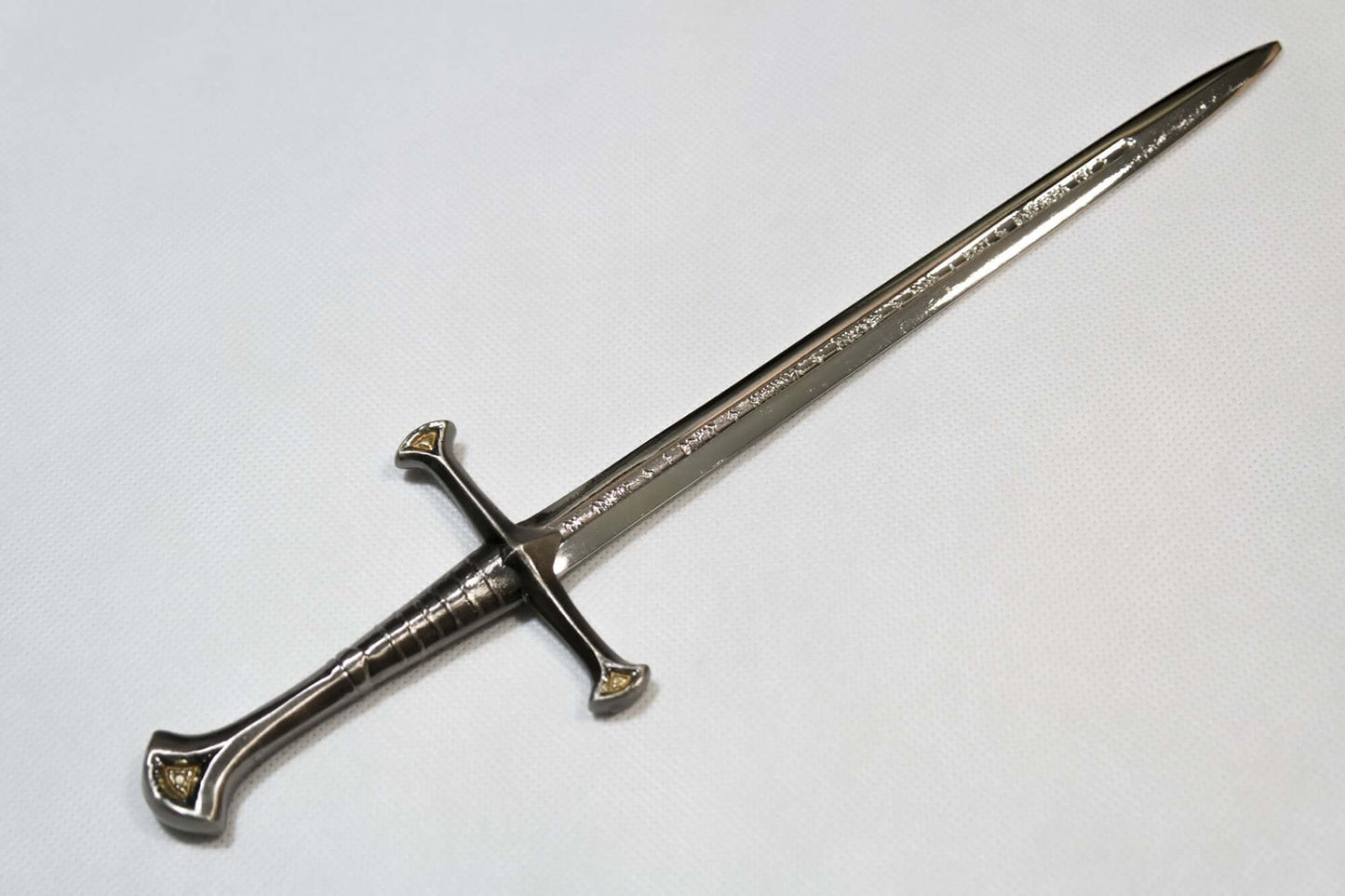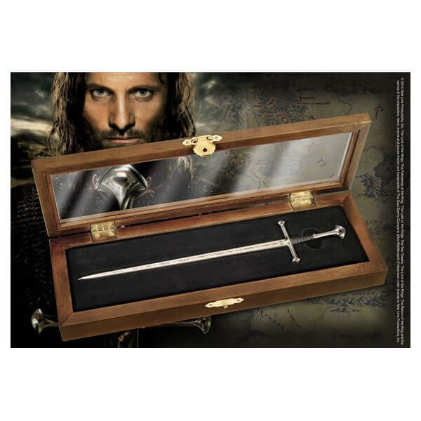 The Flame of the West, forged from the shards of Narsil and wielded by Aragorn, is recreated in miniature as a letter opener measuring approximately 9inches in length. This is Anduril, the sword of King Aragorn. Buy Aragorn's Anduril Letter Opener with confidence from the UK’s leading fandom-Themed shop. Authentic miniature reproduction from The Lord of the Rings. About 23cm in length. Comes complete with a 25.5 x 9cm display box. Stainless Steel blade. The boxed product has a Length of 30cm, Width of 13cm and Depth of 6cm. All dimensions are approximate and may vary from piece to piece. Purchase this stunning product from the world's best fandom-themed shop, "House of Spells".