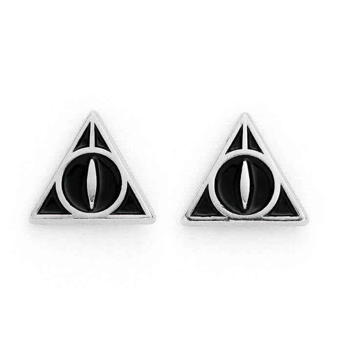 Our Harry Potter Deathly Hallows stud earrings are made up of three symbols, an unbeatable wand, a stone to bring the dead to life, and a cloak of invisibility. When owned by one person, they are said to give mastery over death.
