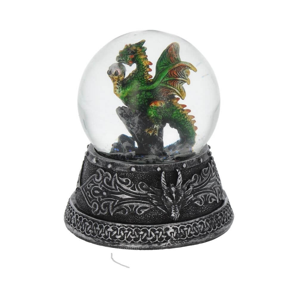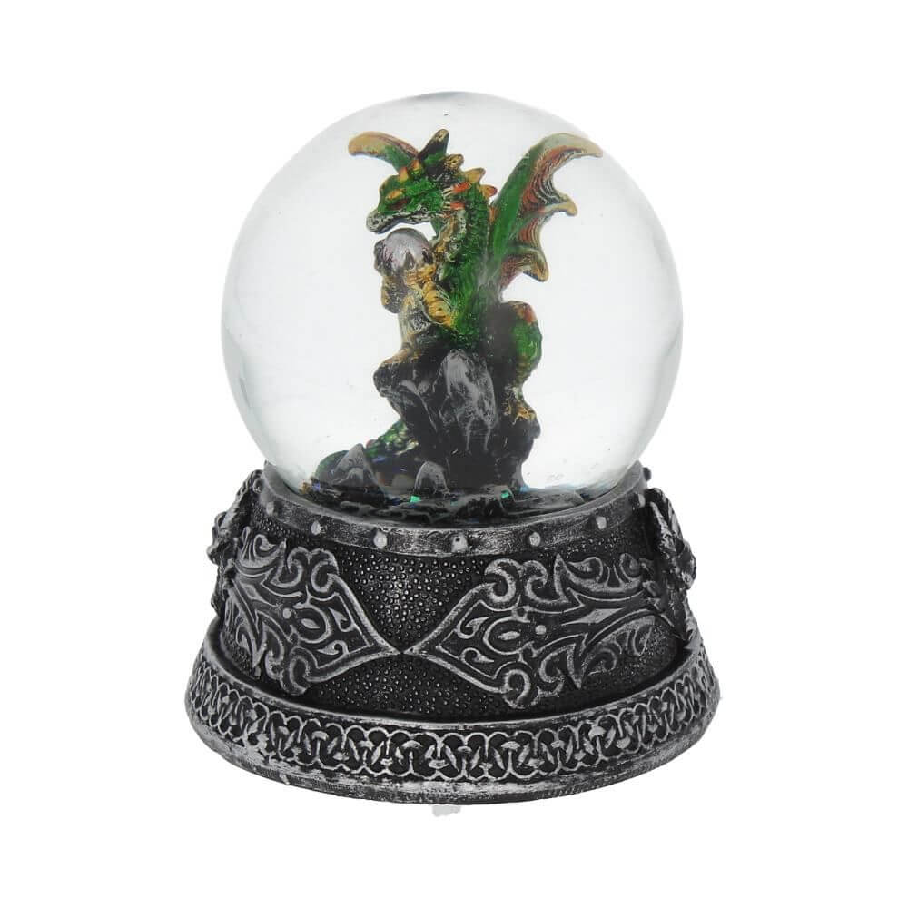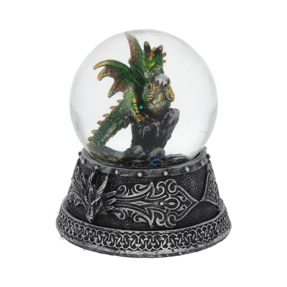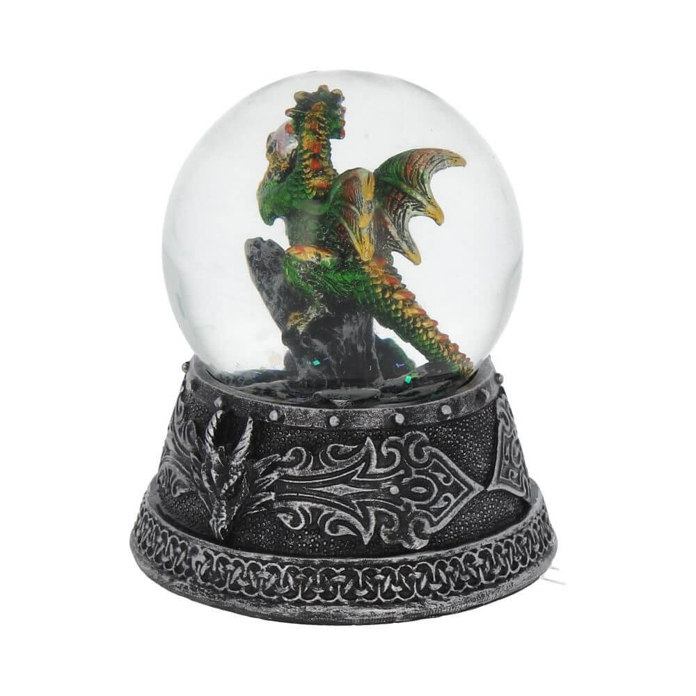 Encapsulated inside a glass sphere, a small green Dragon sits atop a rocky formation, peering down onto his realm. When the globe is shaken, flakes of aurora borealis glitter form a whirlwind, making the scene even more magical. The base is covered with ornate Celtic patterns, surrounding a Dragon's head. Cast in resin before being hand-painted, this globe will add a touch of mystic charm to any room.