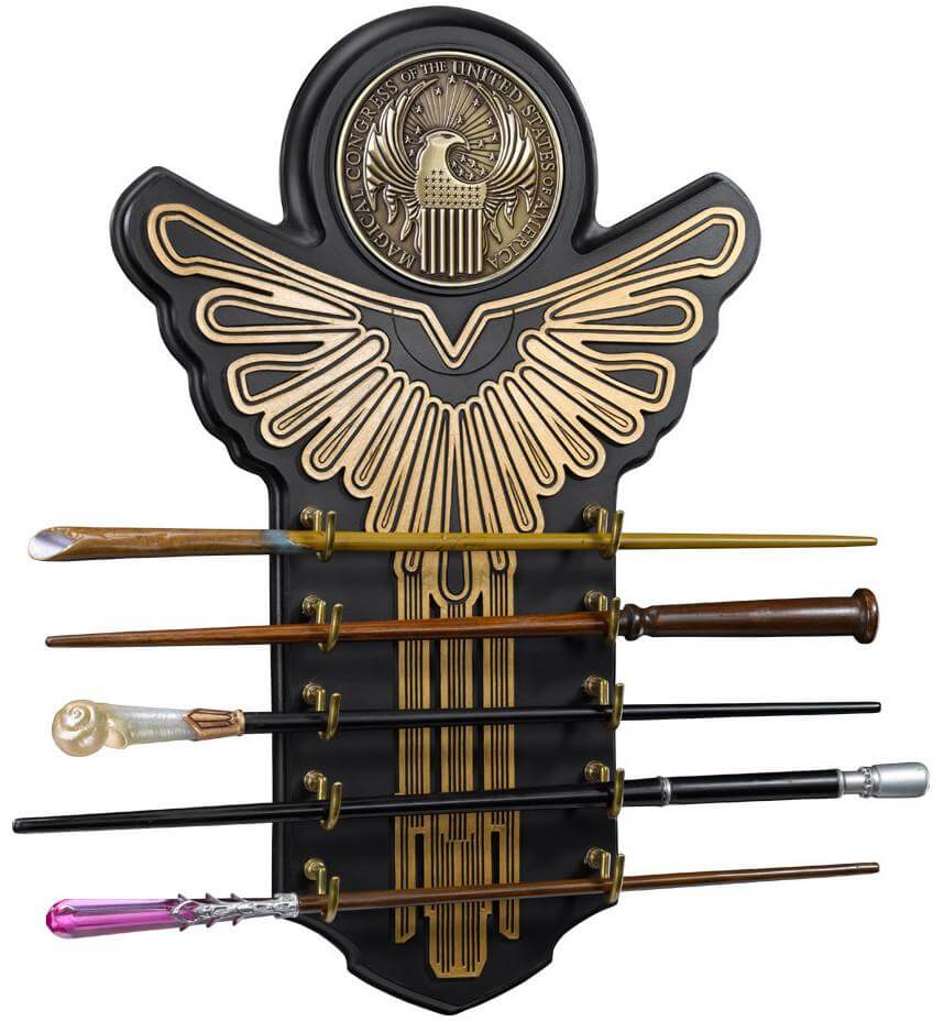 The five Fantastic Beasts wands (Newt, Porpentina, Queenie, Seraphina and Graves) presented on a hand-painted wall display, measuring 16.5 and faced with a die-cast MACUSA emblem.