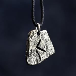 This pendant is of the Ken (Cen) or Kaun rune. Stemming from the Futhorc, a younger form of runes used by the Anglo-Saxons derived from elder futhark, Ken symbolizes "Torch" for illumination, destruction, and death.