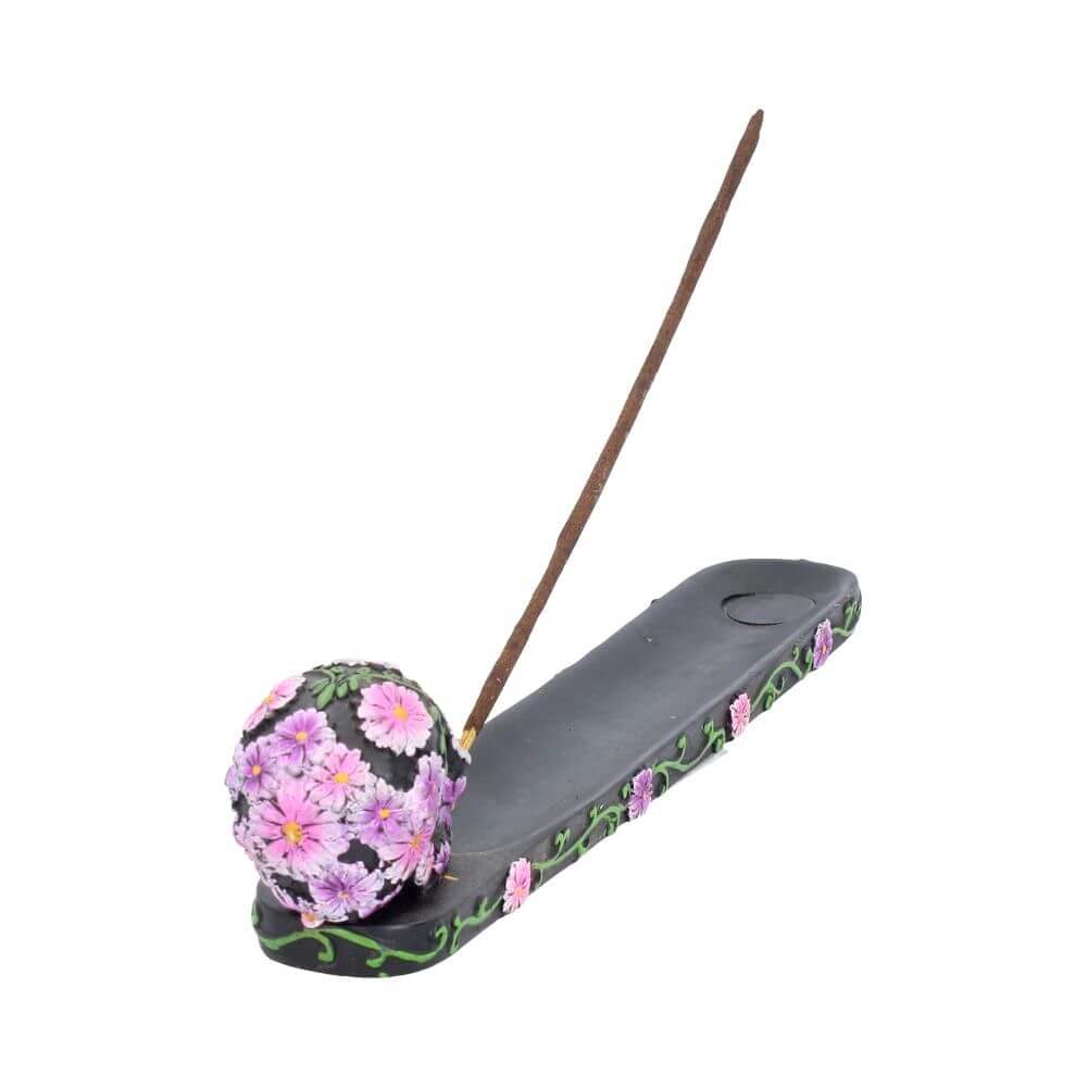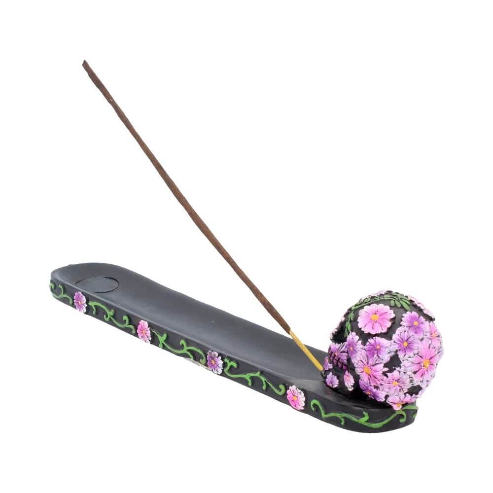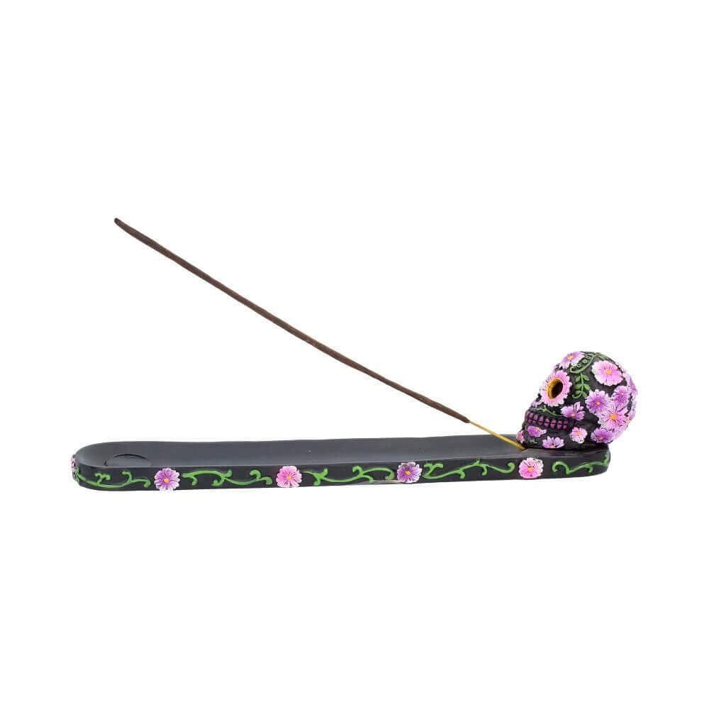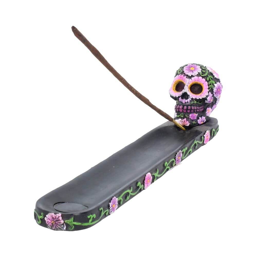 Emblazoned with violet flowers, this black human skull has creeping green vines growing around it, symbolising life being reborn from death. The eyes are highlighted in yellow that matches the pollen of the flowers, and the teeth are a deep purple for an additional splash of colour. The vines and flower motif continues down the side of the burner, which is hand-painted and cast in high-quality resin. Reminiscent of the colourful calaveras of the Mexican Day of the Dead, this incense burner has space for both cones and sticks of incense, ensuring that you can please the spirits of the dead with any scent you (or they) choose.
