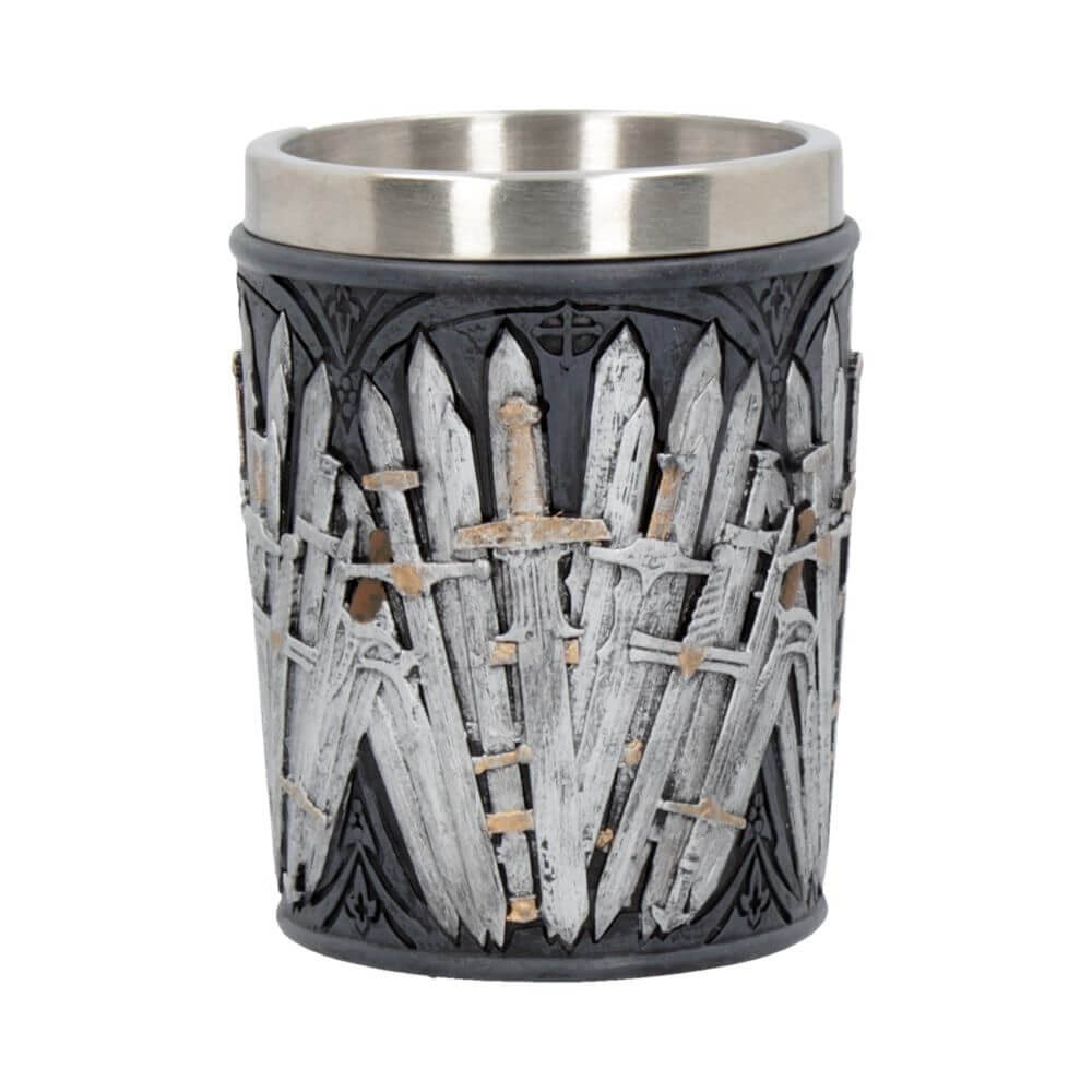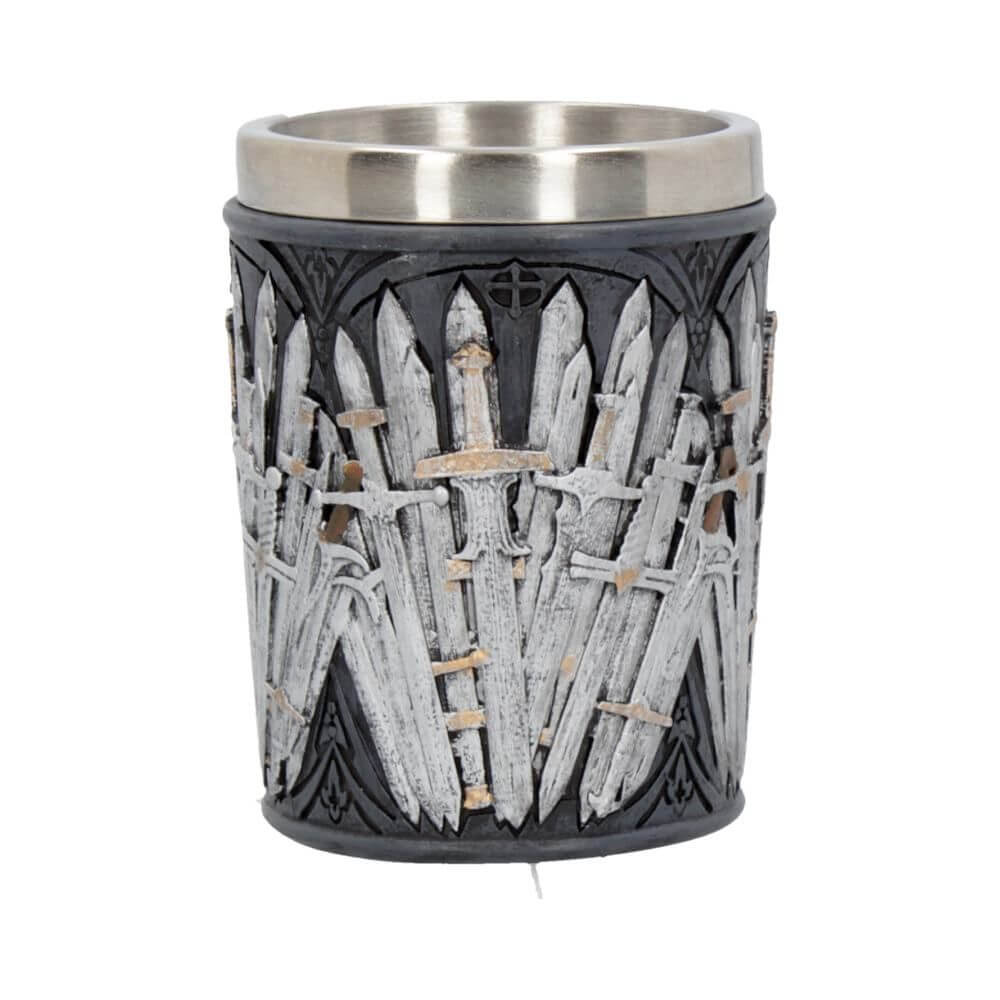 This Shot Glass' body is emblazoned with a multitude of swords on a black background. Cast in the finest resin before being painstakingly hand-painted, this piece comes with a removable stainless steel insert for ease of cleaning.