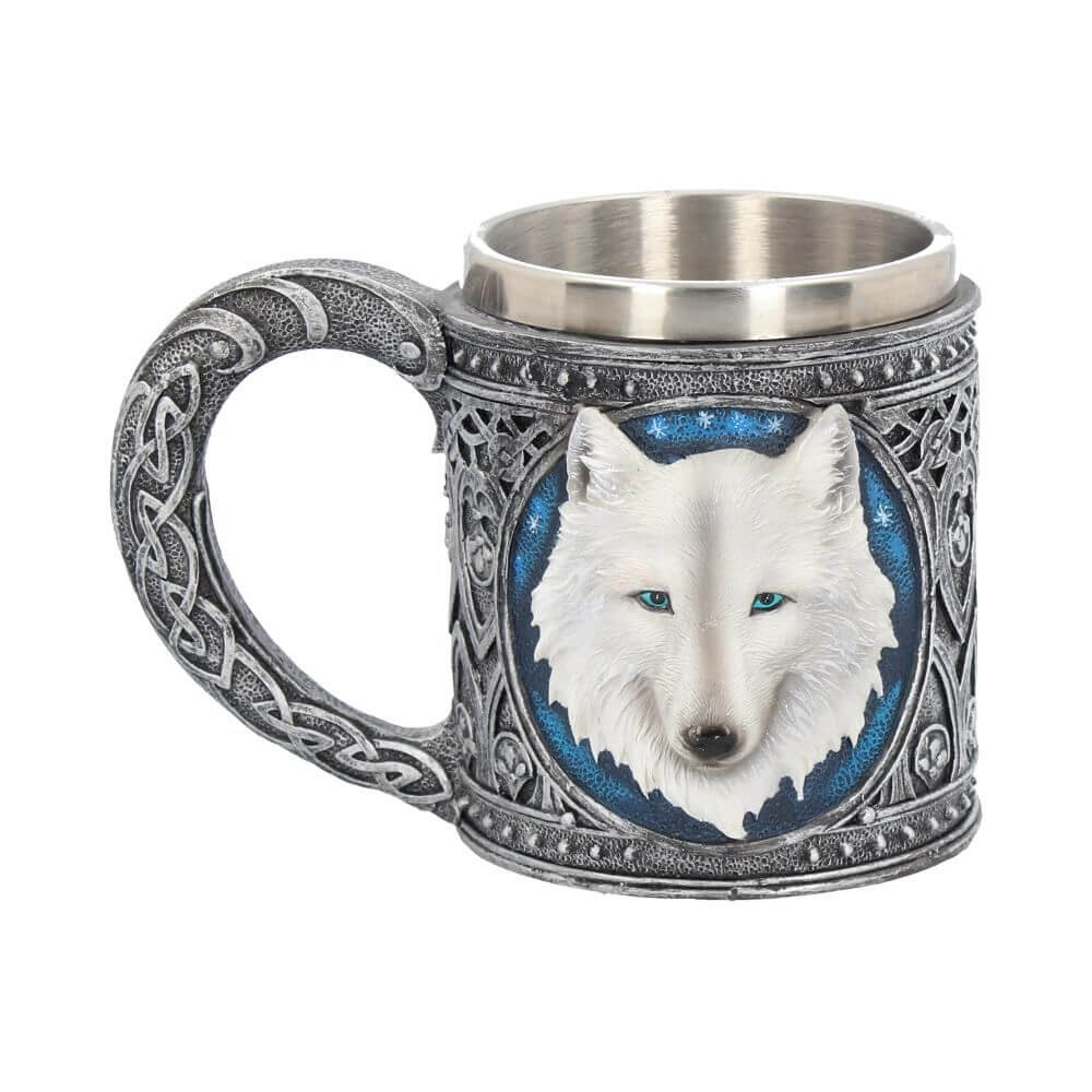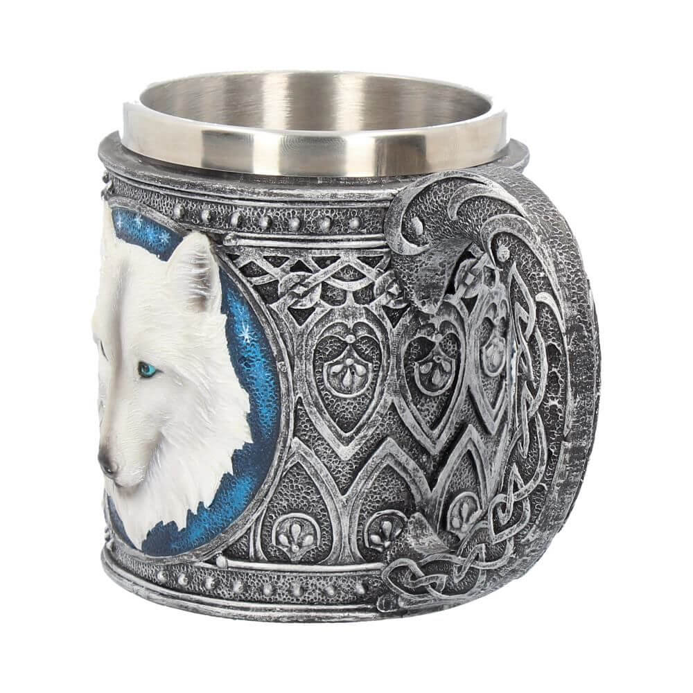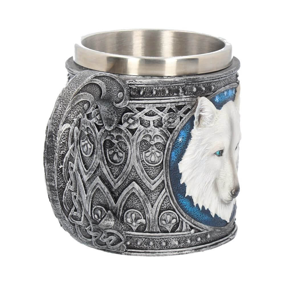 这款维京幻想狼形啤酒杯采用最优质的树脂铸造而成,然后精心手工绘制。这款啤酒杯的主体为银色,表面覆盖着重复的凯尔特结图案,手柄也是如此。它们呈叶子形状,让人想起哥特式教堂的窗户。图案的两侧被一个巨大的蓝色椭圆形打断,椭圆形中央是一只巨大的灰狼头,用红色的眼睛和超自然的智慧凝视着外面。这款啤酒杯配有可拆卸的不锈钢内胆,便于清洁,非常适合那些每次喝一口都能感受到野性的召唤的人。