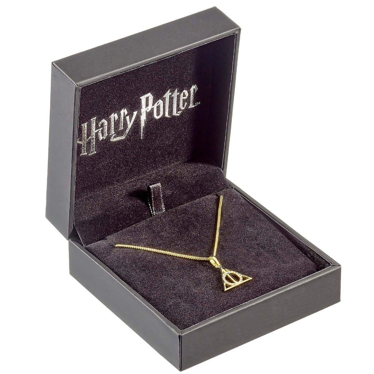 全新官方哈利波特纯银镀金死亡圣器项链,镶嵌施华洛世奇水晶。这是我们施华洛世奇® 水晶哈利波特系列的首款黄金版。这款死亡圣器项链只生产了 1000 条!将按照先到先得的原则出售。金色死亡圣器吊坠镶嵌施华洛世奇® 水晶,搭配纯银镀金链。这款项链采用哈利波特品牌礼品盒包装。
